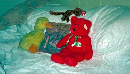 This is the stuffed duck I brought to Roche Harbor. I got the weasel and the bear in Roche Harbor. Actually, the bear is my mom's. While I was in Roche Harbor I read part of the first Harry Potter book.